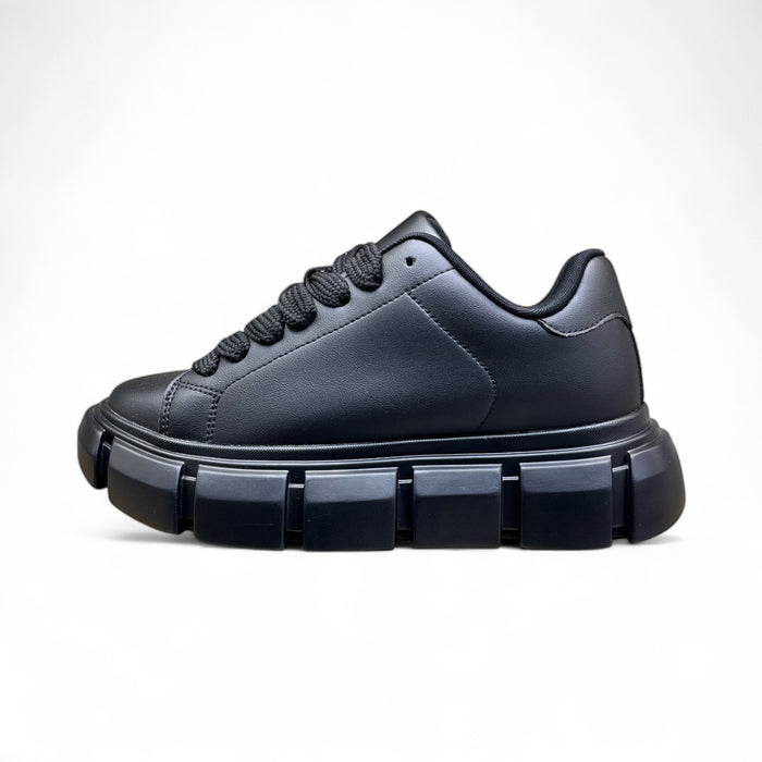 Modern chunky white sneaker featuring a minimalist design with smooth synthetic leather upper and thick geometric sole. The shoe offers a contemporary streetwear look with tonal laces, cushioned collar, and elevated block-pattern outsole for comfort and bold style.