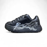 Stylish white sneaker with a smooth synthetic leather upper and artistic wave-line print along the side for a unique modern touch. Features chunky textured sole with soft curves, padded collar for comfort, and classic lace-up design—perfect blend of minimalism and creative street style.