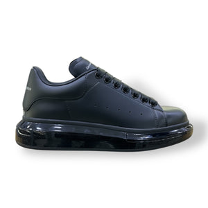 Alexander McQueen's iconic low-top sneakers are crafted from black leather. They rest on signature thick rubber soles and feature subtle perforated detailing in front.