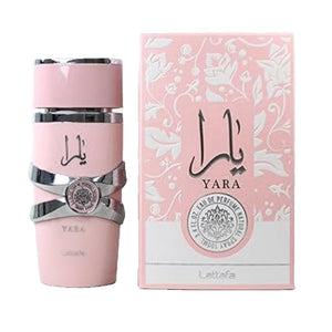 • Visuals & Design: A unique, tall cylindrical bottle in a soft, opaque pink color. It is accented with a metallic, ribbon-like bow around the middle. The box is light pink with a white floral pattern and features the name "YARA".
