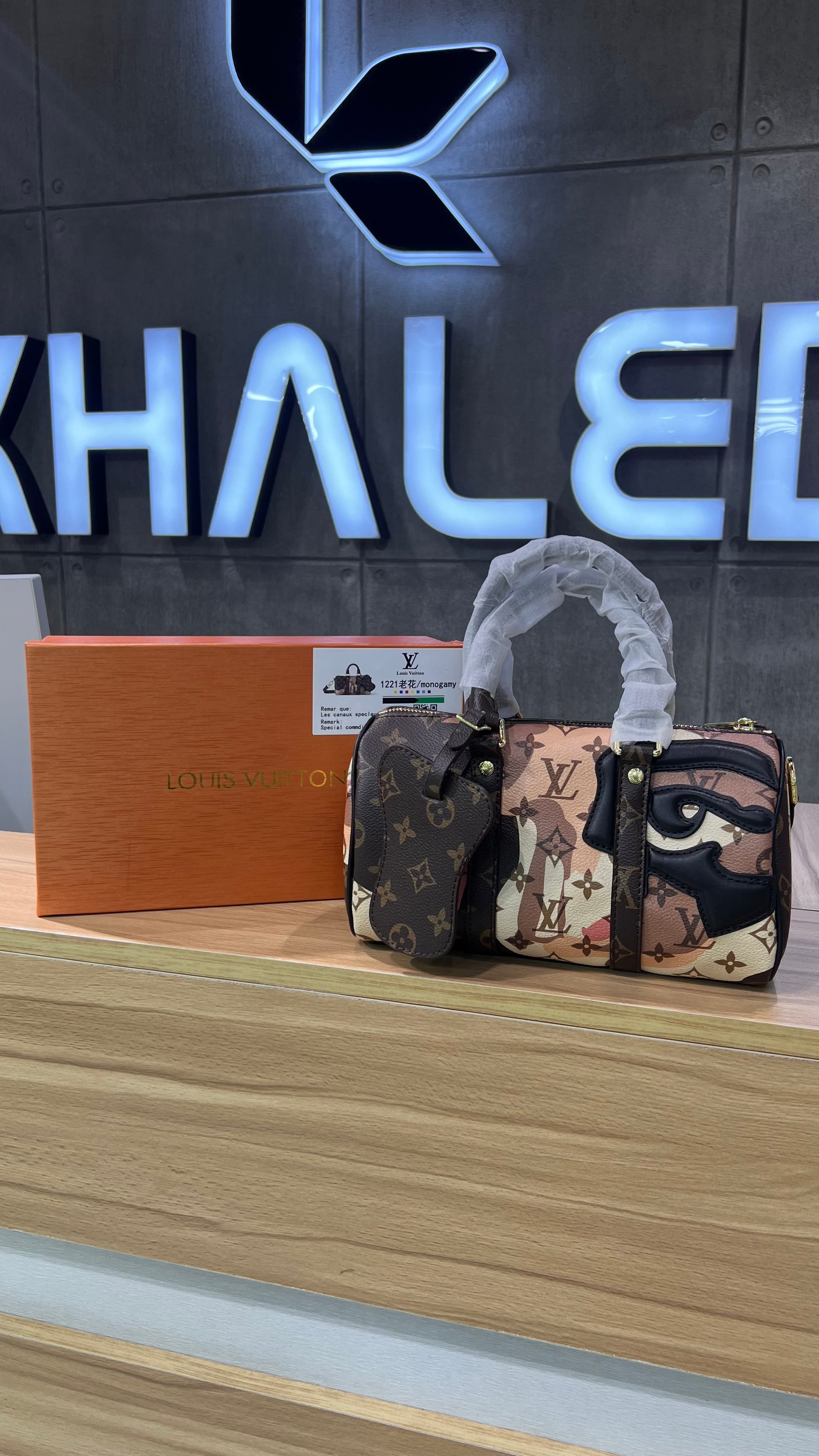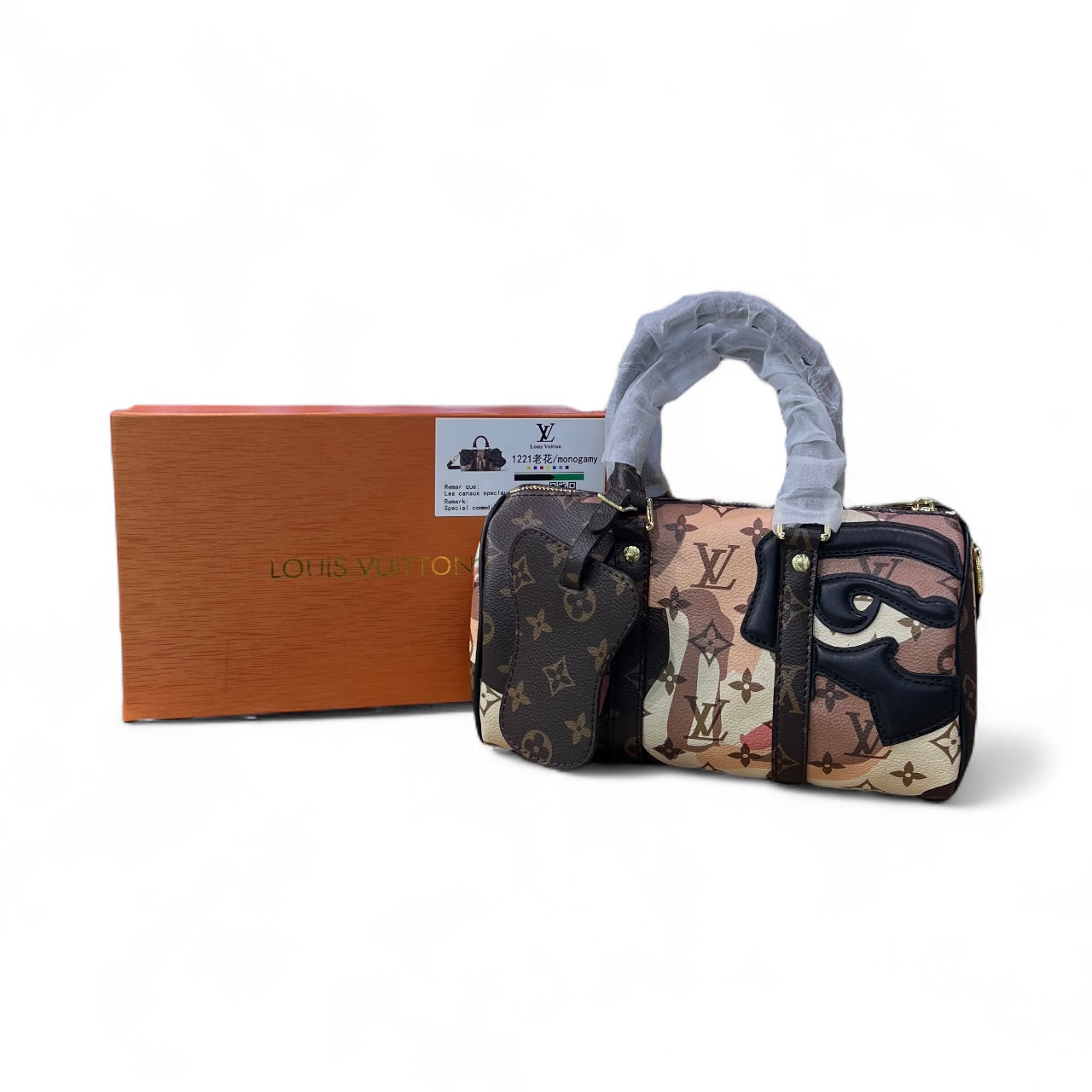 Louis Vuitton monogram canvas handbag featuring a multicolor artistic design with abstract eye motif details. The bag includes dual top handles wrapped for protection, gold-tone hardware, and a matching mini pouch attachment. It comes with an orange Louis Vuitton branded box for presentation.